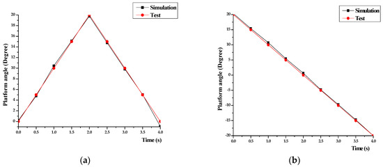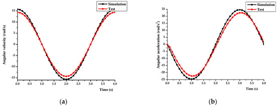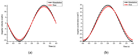 Moreover, in order to confirm the error between simulation and test, the roll and pitch motion path were input into the platform and performed for the actual measurement. In roll motion, the maximum angular velocity of the platform simulation was 15.71 rad/s, and the maximum angular velocity of the actual measurement was 14.55 rad/s. The comparison of the velocity for the simulation and the actual measurement is shown in Figure 21a. The maximum angular acceleration of the simulation was 24.67 rad/s2, and the maximum angular acceleration of the actual measurement was 22.8 rad/s2, as shown in Figure 21b.