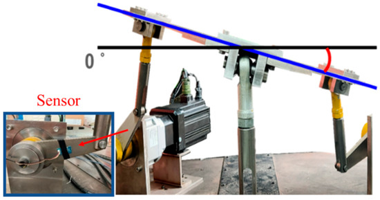 This part was to verify the angle error between the motor output angle simulation and the actual motor output. In the first place, the motion sensor was installed on the crank. Then, the motor trajectory measurement of the platform roll, and pitch motion was carried out. Among them, the roll and pitch motion were to let the upper platform to obtain the actual crank output angle, the average value of the trajectory error, and the standard deviation of the measurement. The angle trajectory test of the platform is shown in Figure 23.