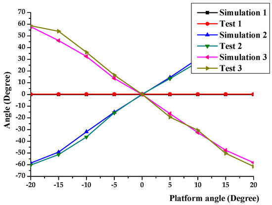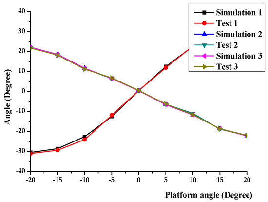 Both of the roll and pitch motions tilted the platform at 0°, 5°, 10°, 15°, and 20°. When the testers controlled the movement of the upper platform, the angle of the three sets of driving motors was measured by the motion sensor. Figure 24a,b shows the motor motion simulation trajectory of the roll and pitch motion.
