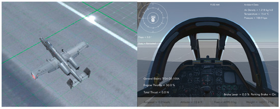 The image was designed for first-person perspective. Final VR content included the image of the aircraft, the outside environment, and the cockpit. The cockpit showed the propulsion power, flight speed, and aircraft altitude, etc. The High Tech Computer (HTC) Vive Pro head-mounted display was set as the pilot’s flight helmet. Therefore, testers could freely watch the outside scenes of the flight through the device, as shown in Figure 28. The content of the flight range was designed to be 1000 m × 1000 m, and the height was 1200 m.
