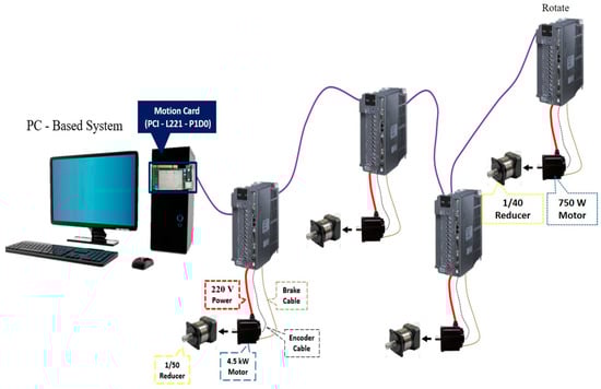 According to this study, the platform had to synchronize with VR images in real-time. Therefore, the control system needed to build on a high degree of synchronization and high transmission speed. In this study, the high transmission speed serial EtherCAT was selected to control the platform. EtherCAT was used to control 3 sets of 4.5 kW and 1 set of 750 W servo drive equipment in real-time, and collocation with planetary gear reducer with a reduction ratio of 1:50. The system was set up in the Visual Studio C# development environment, and the position control commands were compiled on the upper-axis control card. The compiled instructions were transmitted to the servo drive, and the drive sent the position control to the motors through the received instruction. Then, the motors would make the platform motions, and the multi-axis control was performed between the drives by using the master station and multiple sets of slave stations in series. The control architecture was a three-loop closed-loop system, and the position loop was the main control loop. The communication method is shown in Figure 29.