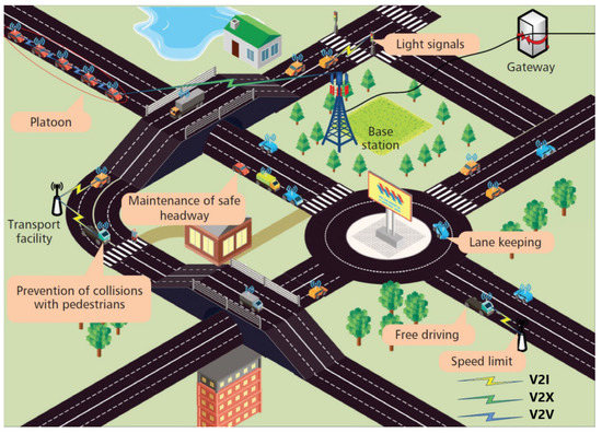 For these reasons, any environment where autonomous vehicles are expected to operate must establish an information exchange activity through specific devices within the ITS (Intelligent Transport System) identified as RSU (Road Side Units). Such tools communicate with AVs so that a single vehicle can be informed about a specific roadway stretch, to perform all the appropriate interventions. Moreover, communication involves the monitoring of traffic and pavement conditions, and this system is identified as SRE (Smart Road Environment) [3]. In Figure 1, it is possible to recognize an example of how an SRE can cooperate with AVs.