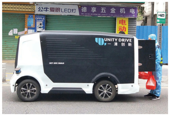 Even if not strictly related to AVs’ mechanical design and dynamics, a risk recently coming under the spotlight is that of health, with a particular reference to COVID-19 and by extension to other sanitary hazards. AV sharing can potentially constitute a carrier of diseases; therefore, proper measures must be identified and implemented to reduce this risk. In the case of Coronavirus, for shared and public vehicles which are used by different users, the infection can be spread mainly by contact with infected surfaces and through airborne droplets. Hence, adequate sanitation systems should be developed and implemented to allow safe sharing conditions, and to increase the sense of trust and safety perception towards shared vehicles; in fact, users might be less enticed to use shared vehicles for fear of diseases. On the other side, it is interesting to note that since AVs can be operated automatically to transport goods and carry out deliveries without the need to employ human drivers (i.e., drones) [11], the risk of transmitting diseases gets potentially reduced, as the interaction between consignees and the driver is basically absent (should they be appropriately designed to minimize contact between the various consignees); AVs are therefore useful also for delivering sanitary goods such as vaccines or bio-hazard materials during pandemics [12]. Moreover, implementing strategies and devices to monitor passengers’ health status on shared AVs can help with controlling and monitoring the spread of diseases over a specific area. In this sense, there is potential for new related ideas for further research studies in the upcoming years. Figure 3 shows the Hercules logistic Autonomous Vehicle used during the COVID-19 pandemic to deliver food and medical supplies.