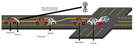 One of these systems’ benefits is that they can reduce the probability of accidents caused by human mistakes, often due to improper driving evaluations or impulsive driving behaviors, due to emotional decisions or instinctive actions rather than logical analysis [31]. Driving reaction times during emergency maneuvers are very short and often will not leave the driver enough time to decide the next move wisely. Automated Intersection Management (IM) systems work by exploiting the communication between vehicles and devices placed on intersections. Vehicles approaching the intersection at constant speed transmit a speed query to the IM, receiving a Yes/No reply depending on other simultaneous requests from other vehicles to optimize flow and manage safety. In case of a positive reply, the incoming vehicle is authorized to proceed and can drive forward, crossing the intersection at the requested constant speed. Should the answer be negative, in that case, the vehicle will slow down and resend new queries to the IM. Once the vehicle crosses the intersection, another signal is sent to the receiving device, communicating that the maneuver has been completed. This system increases the admissible road traffic volume and relies on a large and increasing amount of data to be exchanged between AVs and IM. Hence, its efficiency depends on the accuracy of this shared data. Robust Intersection Manager’s system adds the benefit of tracking vehicles’ trajectories approaching an intersection associated with a Velocity of Arrival (VOA) and Trajectory of Arrival (TOA) as they get close to the junction. This situation leads to increased accuracy and higher safety levels. This system is still subject to hardware or communication errors and even to hacking attempts interfering with vehicle positioning and speed detection. Figure 4 below depicts the dynamics of an accident happening with these systems.