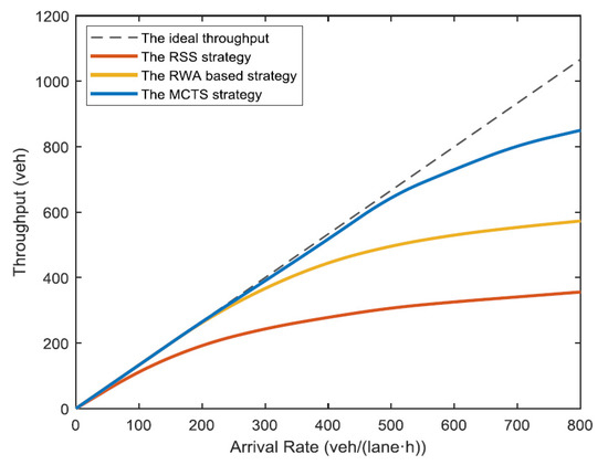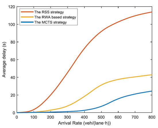 The use of new strategies, based, for instance, on the Right-of-Way Assignment (RWA), can improve traffic dynamics in the presence of non-signalized intersections. This strategy is based on marking short-term decisions for the right of ways and on one-to-one communications. Other assumptions include that two vehicles can cross the intersection simultaneously and that pilot vehicles can obtain information about speed, location, and driving intentions of other surrounding vehicles. Moreover, priority levels and precedence rules are defined. A related strategy, called Cooperative Driving Strategy (CDS), introduces the assumption and possibility that the information connecting all the elements involved in traffic (pedestrians, bicycles, and vehicles, to name a few) is available via a V2X communication system, which can cover up an area of 300 m or even more. This methodology splits the junction in a grid made of several smaller areas, regulating vehicle traffic by setting up the minimum time interval between two vehicles. Results from dedicated research studies [32] show that this approach leads to higher performances compared, for example, to a traditional Responsibility Sensitive Safety (RSS) approach (which applies a typical First-In/First-Out (FIFO) strategy with few communications). Figure 5 and Figure 6 show a significant difference in performances between RWA/CDS and RSS, specifically in terms of average delay/arrival date and throughput/arrival rate ratios.