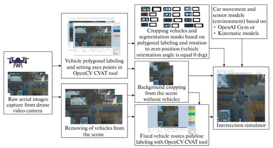 Simulation models for AVs at intersections can also be trained thanks to machine learning, specifically Reinforcement Learning (RL) and computer vision. Aerial photographs can provide visual information about the road intersection to create a simulated model. The vehicles’ position, both autonomous and manned, can be detected using deep neural networks of various kinds [33]. Vehicles in the intersection can be detected with the segmentation technique, starting from a full-color aerial image of the crossroad captured with drones and then post-processed, moving through computerized Fully Convolutional Network (FCN), creating a B/W image which then becomes clustered through a DBSCAN. With the OpenCV CVAT software tool, vehicles on the aerial images are marked and labeled with polygons (rectangles and ellipses), indicating the relative location. Possible trajectories are marked with polylines as well. Vehicles are finally manually removed from the image, leaving the polygons on. The image becomes then binarized and clustered into closed regions with the DBSCAN algorithm, filtering and discarding the smaller regions. From this point onwards, the simulation is undertaken thanks to the application of complex neural network algorithms that eventually lead to a calibrated and portable model, which can then be included in larger Automated Intersections systems.
