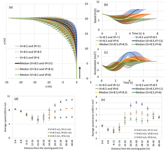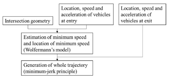 It is helpful to remind, with a brief excursus, that artificial or electronic neural networks are computational systems inspired by and resemble biological neural networks, i.e., the complex system of neurons (nodes) and synapses (connectors) typical of animal brains. These systems allow the reconstruction of real-life scenarios characterized by the presence of scattered and interacting elements. It is beneficial, for instance, in camera detection whenever the nodes are hard to spot due to bad weather conditions, low light conditions, or obstacles concealing them [34]. Image segmentation can be performed with systems like Structured Inference networks [35], based on the assumption that the analyzed data conforms to a Gaussian State Space Model (GSSM). Commonly, algorithms to train neural networks fall into three major types: Levenberg-Marquardt, Bayesian Regularization, and Scaled Conjugate Gradient [36]; adopting the best fitting algorithm depends indeed on the geometry of the collected dataset and the surrounding scenario. Deepening into Artificial Intelligence and Machine Learning would require a reliable dissertation as the subject is pervasive and has its particular field of study. Therefore, it will not be treated in detail in this article. Other similar approaches allow modeling vehicle trajectories and their variations for vehicles turning at intersections [37]. One of the methodologies adopted for this purpose exploits the principle of “Minimum Jerk”, i.e., a model initially developed to describe a human arm’s biodynamics in a plane, later extended to robotics eventually to AVs for studies on motion control. This model states that a jerk function can represent movements performed by the arm to carry out tasks like writing or drawing. The minimum jerk is found by minimizing this function through integration within an interval between a given initial location and a final location within a given time. The Minimum Jerk model and other support models aimed to identify minimum speeds and the vehicle-related position [38,39]. When inserted into a simulated framework, these allow estimating turning vehicles’ trajectories at an intersection. These estimations can be incorporated into automatic intersections to achieve the benefits already mentioned in this paper. It is interesting to remind that simulations created with all these models must also deal with human driving behaviors, which statistically depends on parameters [40], such as age, driving skills and training, and state of lucidity and attention, not to mention all those random parameters that could be present (even the presence of an insect could disturb the driver and cause an accident). The implementation of AVs [41] would ideally fix these issues, as the model’s random or less predictable components are removed since the driver is absent. This situation should lead to even higher optimization levels, increasing safety and reducing travel times, to mention a couple of benefits. Figure 8 summarizes with a flowchart the process and steps that define the Minimum Jerk approach. In contrast, Figure 9 shows an example of the computer output, reporting the comparison between paths (a), speed profiles (b), acceleration profiles (c), aggregated speed profiles (d), and aggregated acceleration profiles (e) for different exit speeds.