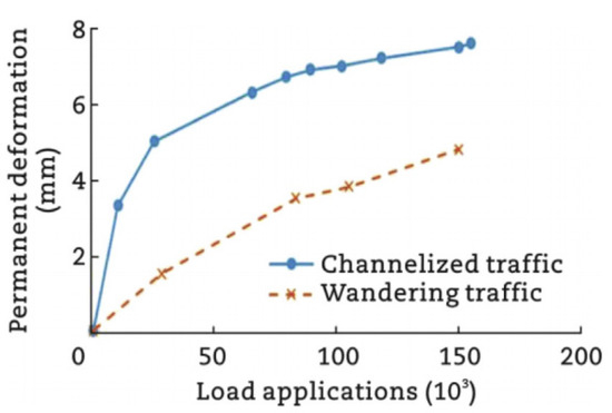 So, the subsequent deflection will be higher. Such issues can be managed with a technique named “strip road concept,” consisting of installing two parallel strips made of asphalt, concrete, or improved soil positioned in correspondence to specific vehicles’ wheels that will transit on that roadway. Significant localized stress pavement is subjected to AVs. It was detected during accelerated pavement testing (APT). It is noted, in Figure 10, different pavement responses under expected AVs and conventional vehicle loading respectively channelized and wandering traffic conditions standard hot mix asphalt surfaced.