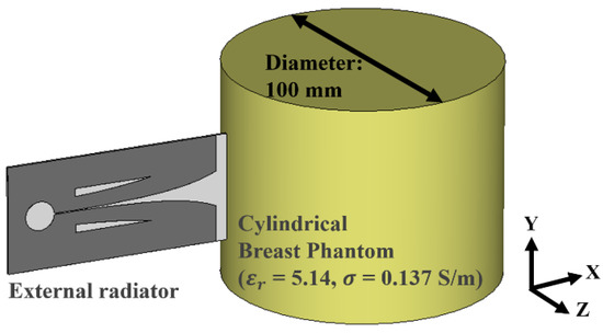 The configuration of the proposed system is presented in Figure 1. The system consisted of an external microwave radiator with an artificial cylindrical breast phantom. All simulation and experimental results were based on the configuration of Figure 1. To verify the electromagnetic effects of the proposed antenna on the human body, an artificial breast phantom was formed with homogeneous material that takes into account the fatty component ( = 5.14, σ = 0.137 S/m) of the human breast [18]. The external radiator was in direct contact with the breast phantom to achieve maximum electromagnetic wave transmission.