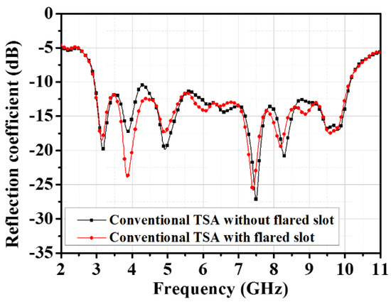 where R is the exponential rate and , and indicate the start- and endpoints of the slotline [19]. A microstrip-to-slotline transition technique was applied to achieve stable wideband characteristics [20,21]. To achieve a wideband transition, the microstrip-radial-open stub and slotline-round-short stub present virtual short and open circuits, respectively. The designed antenna interacted with the high dielectric human breast, so impedance characteristics had to be enhanced in order to maximize power transformation. Therefore, we designed flared slots to enhance the reflection coefficient in 3.5–5 GHz. The flared slots were designed near the input aperture of the tapered slot, where the current flow was strong, for effective input impedance control. The step impedance can be changed by controlling the exponential rate of the flared slots. After fine-tuning, the impedance matching characteristic was partially enhanced in the 3.5–5 GHz, as shown in Figure 3. A full-wave simulation was performed with Microwave Studio of Computer Simulation Technology (CST). As a result, the proposed TSA achieved optimal wideband operation in the 3.1–10 GHz.