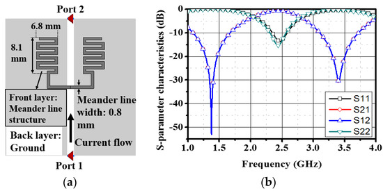 Meander line resonator with band pass characteristics: (a) Geometry of the meander line structure and (b) S-parameter characteristics.