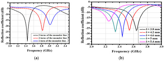 The meander line structure was based on the cascade connection of several individual line segments. The equivalent lumped circuit of the transmission line segments could be calculated using the T-equivalent network from the equations provided by [23] to reasonably approximate relative changes in the resonant frequency. Changes in the narrowband resonance in terms of the number of turns of the meander line and line length are represented in Figure 6a and b, respectively. For the proposed antenna, both a compact size of 6.8 mm × 8.1 mm (0.11 × 0.13) and band-pass filter operation could be achieved by adopting the meander line structure, the S-parameter results of which are shown in Figure 5b, which verified the band-pass operation at 2.45 GHz.
