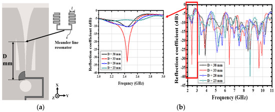 (a) The integrated position of the meander line resonator for narrowband operation and (b) comparison of the simulated reflection coefficients in terms of position D.