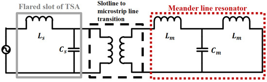 To design the frequency switchable antenna, a meander line resonator was printed on the back layer of the wideband antenna, as shown in Figure 7a. The middle point of the symmetric meander line resonator was placed at a point corresponding to the middle of the flared slot. When the current flows alongside the flared slot, an E-field is formed between the two plates of the slot, and EM energy is transferred to the meander line resonator. The combined equivalent circuit model of the TSA and meander line resonator is shown in Figure 8.