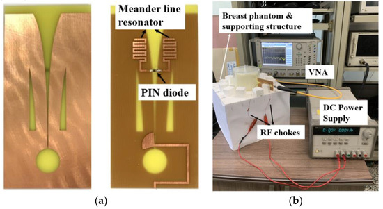 As mentioned earlier, a meander line resonator was printed on the backside of the TSA. To achieve frequency switchable characteristics, an SMV 1231 PIN diode switch was inserted in the middle of the meander line resonator to control the current induced by the flared slot, as shown in Figure 9a. In Figure 9b, the measurement configuration with a fabricated breast phantom and supporting structure is represented. The DC biasing line was connected to the DC power supply through the inductors for RF choking, and the bias voltage was 0.8 V in order to activate the diode.
