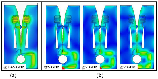 Simulated current distributions: (a) resonance mode at 2.45 GHz with the PIN diode in the ON state and (b) traveling-wave mode at 5, 7, and 9 GHz with the PIN diode in the OFF state.