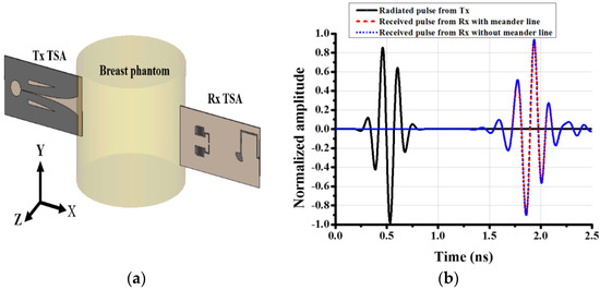 To verify the radiation characteristics of the proposed antenna in the breast phantom for a microwave imaging system, time-domain results were analyzed. In a microwave UWB radar-based imaging system, high-quality image reconstruction can be achieved when the antennas transmit and receive short-duration microwave pulses through a lossy material. In this process, a radiated pulse from the transmitting antenna passes through the breast phantom with low distortion and high efficiency. The Tx and Rx TSAs face each other through the phantom diameter (100 mm), as shown in Figure 12a. The radiated and received pulses both with and without the meander line resonator are shown in Figure 12b. By comparing the shapes between the transmitted and received pulses, it was evident that the proposed TSA exhibited low-pulse distortion characteristics, and the meander line resonator did not affect the pulse characteristic.