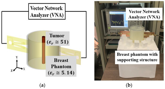 Breast cancer treatments are being developed rapidly to reduce the dangerous radiation associated with conventional methods [1]. The early detection of breast cancer has received significant attention among research groups, and common techniques are based on X-rays, magnetic resonance imaging (MRI), and computer tomography (CT) [2]. However, these techniques have numerous drawbacks such as ionizing radiation, high cost, health risks, and so on. Radar-based microwave imaging is an effective tumor detection method. In this method, malignant tissues within the breast can be detected because of significant differences in the dielectric properties between normal breast cells and tumor cells. These images can be produced by employing ultra-wideband (UWB) antennas [3,4,5,6,7]. These antennas transmit and receive short-duration pulses and detect the scattered signal differences between normal and malignant tissues.