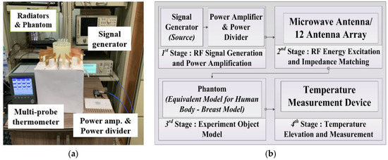 To operate as a hyperthermia system, Figure 15 shows the required configuration of the temperature measurement setup, block diagram of the temperature measuring system (which was composed of the RF signal generation and amplification, as well as RF power division and excitation), and the temperature observation [9,10]. The proposed antenna must exhibit equal polarization characteristics to achieve an effective E-field synthesis in the target area. For hyperthermia application, the specific absorption rate (SAR), which is proportional to the square root of the E-field, is analyzed to verify the radiation characteristics in the breast phantom [9]. In Figure 16a, the variation of the normalized SAR with the number of antennas is presented to verify the EM energy concentration at the center of the breast phantom (x = 0 mm), from which it was evident that the SAR increases by increasing the number of antennas to the target position. To verify the thermal effect for tumor necrosis, the effective treatment area (ETA) was defined [9]. The ETA was regarded as a region in which the tumor satisfied the thermal requirement of the temperature rise, 7–10 °C. The temperature increase measured inside the breast phantom, heated by a 12-array antenna for 1 h, is shown in Figure 16b. The red circular region signifies the ETA, which covers the tumor size.