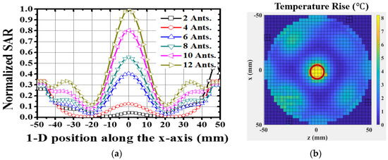 (a) Comparison of normalized SAR in terms of the number of antennas along the x-axis of the breast phantom, and the (b) measured temperature distribution inside the breast phantom with 12 antennas.