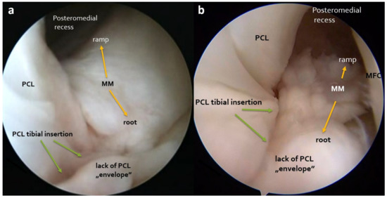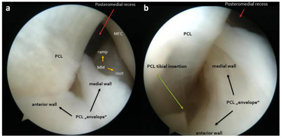 9]. To visualize the PCL envelope in a PCL-intact knee, we performed the arthroscopy through standard anterolateral and anteromedial portals using a 30° arthroscope. After a thorough inspection of the whole joint, the PCL was assessed anteriorly and then the arthroscope was positioned between the PCL, MFC, and over the posterior horn of the medial meniscus (MM) and inserted into the posteromedial recess using a trans-notch maneuver. Initially, visualization was directed medially toward the “ramp” of the MM. Then, the arthroscope was gradually withdrawn with rotational movements until the moment when the MFC and posterior root of MM and its shiny white fibers were observed. In this position, a soft tissue cuff coursing around the PCL tibial attachment could be observed (