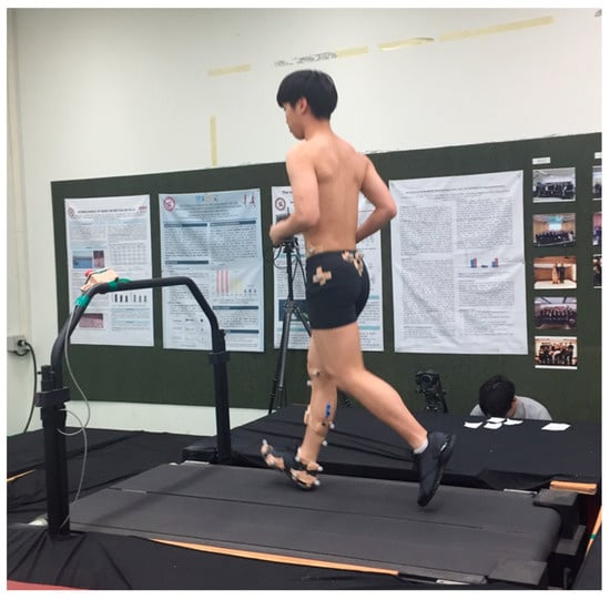 The subjects participated in the experiment by wearing shoes in a randomized order, and the selection of the shoes was blinded during the experiment. Each subject had a 5–10 min adaptation period to perform natural running on a treadmill (Instrumented Treadmill, Bertec, Columbus, OH, USA). Subsequently, 15 reflective markers (left and right posterior superior iliac spine, sacrum, left and right greater trochanter, right medial femoral condyle, right lateral femoral condyle, right medial malleolus, right lateral malleolus, right heel bone, right medial talus, right lateral calcaneus, right first metatarsal head, right fifth metatarsal head and right first phalanges) were attached to the lower extremity of each subject. Each subject ran at a speed of 2.7 m/s on the treadmill where eight infrared cameras (Oqus 300, Qualisys, Göteborg, Sweden) were installed (Figure 1) [23]. Ten consecutive strides showing a consistent running pattern were collected and analyzed. The data were collected at a sampling rate of 100 Hz for kinematic data and 1000 Hz for kinetic data.