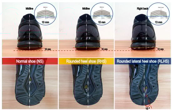 The normal shoes (NS) utilized were commercially available (Figure 2, left). The RHS was a modified NS with a curved shape 5 mm higher than the NS in the central heel (Figure 2, middle). The RLHS had a curved shape of about 15° laterally, and it was manufactured 3 mm higher (Figure 2, right) compared with the NS. The shoes used in this study were manufactured and provided by the same manufacturer (LS Networks, Gimhae-si, Korea) to keep the shoe materials and structures the same except for the differences in the curved shape of the outsole. These modifications in heel design were based on biomechanical considerations regarding heel contact during running (i.e., sagittal heel strike [20,24] and toe out angles [25,26,27] as well as the location of impact [28]).