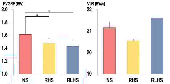 PVGRF (left) and VLR (right) during the stance phase of running. PVGRF: peak vertical ground reaction force, VLR: vertical loading rate, NS: normal shoe, RHS: rounded heel shoe, RLHS rounded lateral heel shoe. * indicates a significant difference between the shoes at α = 0.05.