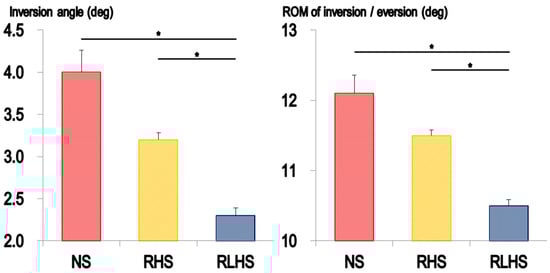 Concerning the ankle joint inversion angle at toe-off, the value for NS was 4.0 ± 4.5°, for RHS was 3.2 ± 3.9° and for RLHS was 2.3 ± 3.7° (Figure 4, Table A2, Figure A1.). There were significant differences between the shoes: F = 4.305 (p = 0.021), the effect size was = 0.185 and the statistical power was 0.715. The inversion angle of the RLHS at toe-off was statistically smaller than for the NS and RHS (p < 0.05). As for inversion–eversion ROM during running, NS was 12.1 ± 4.3°, RHS was 11.5 ± 4.3° and RLHS was 10.5 ± 3.8°. There were significant differences between the shoes: F = 5.041 (p = 0.011), the effect size was = 0.210 and the statistical power was 0.785. The inversion–eversion ROM of the RLHS was smaller than for the NS and RHS (p < 0.05). There were no significant differences in ankle joint moments between the shoes (Figure A2).