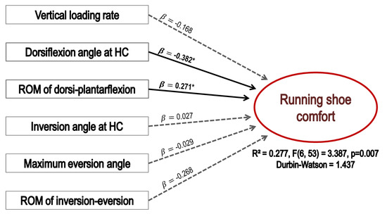 Diagram of multiple regression analysis for running shoe comfort using biomechanical factors. * indicates a significant difference between the shoes at α = 0.05.