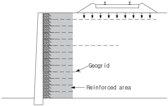 However, as the application of reinforced soil retaining walls increased, interest in the use of short reinforcements also increased. Tatsuoka et al. presented studies on the applicability of short reinforcements with a length of 35% of the height of the wall (0.35 H) integrated with a rigid wall [11,12,13,14]. In South Korea, a reinforced subgrade for railways (RSR) was developed, and related studies have been conducted [15,16]. It was recently applied to real scenarios, and its long-term application has been verified [17]. RSR is a reinforced rigid wall construction method, in which the backfill is pre-constructed using nets of welded rebars and short geogrids of length 0.35 H. The wall is then integrated with the geogrid using connectors. RSR using short geogrids has a relatively narrow reinforced area compared with that using long reinforcements, as shown in Figure 1, and the overburden load is frequently worked outside the reinforced area. In this case, the behavior of the RSR is expected to be different in terms of the settlement and horizontal displacement of the wall because there is a difference in the tensile force of the geogrids inside the reinforced soil, which is caused by the overburden load. Kim et al. investigated the behavior of a reinforced rigid wall for a vertical load applied outside the reinforced area using model tests [18]; however, related studies are scarce.