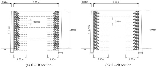 A full-scale RSR was designed and constructed for loading tests toward a single railroad subgrade; the height, width, and length were 5, 6, and 20 m, respectively, as shown in Figure 2. It was composed of four sections with different vertical spacings, geogrids lengths, and wall-reinforcement connection methods to analyze the behavior of each section using two loading tests, as shown in Figure 3. The specifications of each section are presented in Table 1. The length of the reinforcements was determined to be 0.3–0.4 H, which is the range that can ensure stability during construction [15].