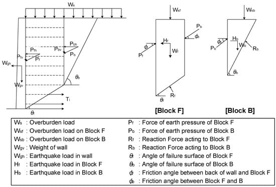 Each section was designed using the two-wedge method, which calculates the earth pressure acting on the wall and the minimum factor of safety from the equilibrium of the force [19]. The force acting on the two soil wedges is calculated while varying the angle of the two lines that form the failure surface in the backfill, as shown in Figure 5. Table 4 shows the safety factors of the circular failure, overturning, and sliding of each section. In all cases, it was confirmed that the safety factors satisfied the specifications of the Korean Railroad Network Authority [20]. The resisting moment is calculated by the multiplication of resistance and moment arm, so the narrower vertical spacing of the reinforcement increases the safety factors of overturning. In the cases of the reinforcement has short length (1R section) or wide vertical spacing (2L, 2R section), the safety factor of overturning tends to be smaller than sliding. However, in the 1L section where the reinforcement has sufficient length and narrow vertical spacing, the safety factor of overturning is larger than sliding.