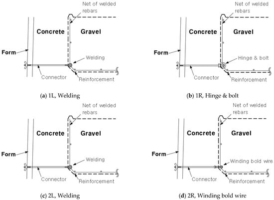 The first and second loading test areas consisted of the 1L–1R and 2L–2R sections, respectively. Each area was constructed separately using the construction joints. The construction of the RSR proceeded in the order shown in Figure 6. The wall-reinforcement connections were constructed differently for each of the three types, as summarized in Table 1. The cross sections of each connection method are shown in Figure 7.