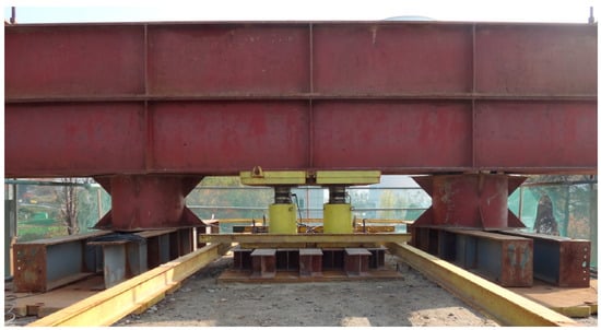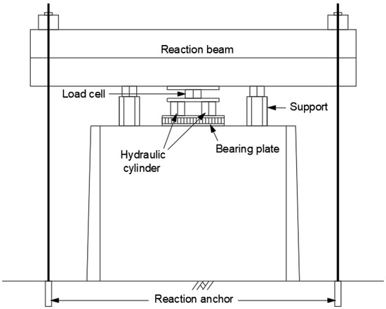Considering the failure of the RSR, the maximum load was set to 1000 kPa, which is 20 times the design load of 50 kPa. A reaction beam was installed on the RSR and loaded using a hydraulic cylinder installed between the reaction beam and the surface of the RSR. The earth anchor to hold the reaction frame was designed such that the design load per hole was 1100 kN. The earth anchors were installed 1 m apart from the RSR, and six holes were installed in each test area, with a total of 12 holes. A 2 × 3 m plate was installed on the surface of the RSR, and H beams were arranged on the loading plate so that the load from the hydraulic cylinder was evenly distributed. Four hydraulic cylinders were installed in a 2 × 2 arrangement. For the reaction force beam, four H-beams (944 × 302 × 32 × 64 mm, L = 10 m) were arranged in two stages to ensure sufficient bending stiffness. Figure 8 shows the cross section of the loading system, and Figure 9 shows the foreground of the loading system.