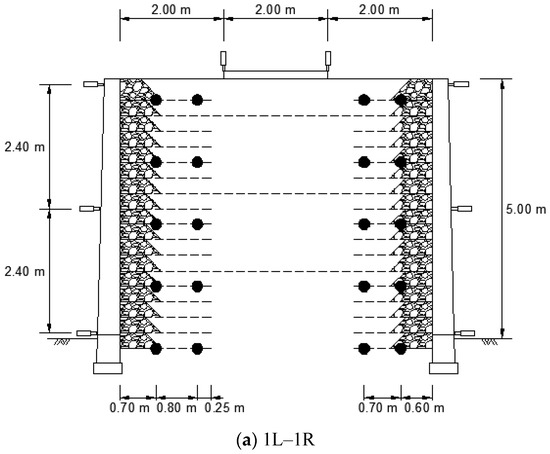 The measurement sensors consisted of strain gauges that were installed on the geogrids during the construction of the RSR and displacement sensors (vertical and horizontal). As shown in Figure 10, during loading, vertical displacement was measured at the four corners of the loading plate to measure the amount of settlement with respect to the loading step. Three horizontal displacement sensors were installed on the wall at heights of 0.1, 2.5, and 4.9 m to measure displacement according to height. Geogrid strain gauges were installed at a spacing of 1.2 m in height. They were installed 0.7 and 1.5 m from the wall in the 1L and 2R sections, and 0.6 and 1.3 m from the wall in the 1R section.