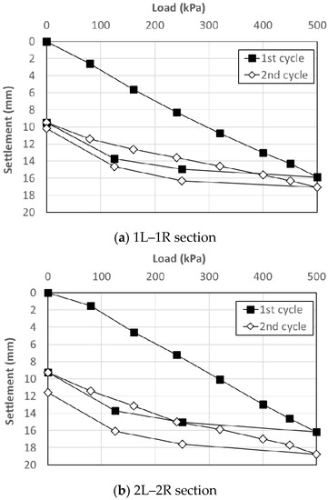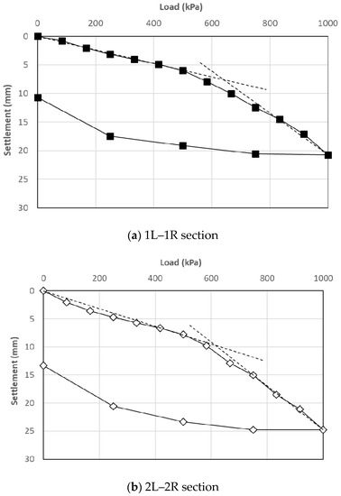 The allowable bearing capacity of both sections were calculated, as shown in Table 7, using the P-S curve method (Figure 13) and Bowles’s equation considering a safety factor of 2. The allowable bearing capacity (qa) and modulus of the subgrade reaction (Ks) of the soil were calculated according to Equations (1) and (2), as described by Bowles [23]: