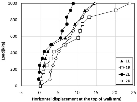 The horizontal displacement of the wall at the maximum load (1000 kPa) occurred in the order of 1R > 2R > 1L > 2L, which tends to decrease because the length of the reinforcement is longer, and the horizontal displacement of the 1R and 2R sections is reversed above a load of 500 kPa. Because the horizontal behavior of the wall changed at a load similar to the yield point of the load-settlement curve, this phenomenon may be highly related to the yield of soil and the tension of the reinforcement in the reinforcement area. As the plastic deformation of the soil proceeds, the effect of the reinforcement on the horizontal displacement of the wall increases. Moreover, a longer reinforcement length decreases the deformation of the wall; thus, the load-wall horizontal displacement curve appeared, as shown in Figure 14.