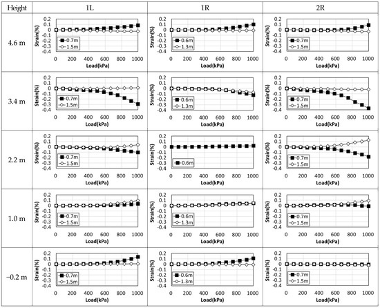 Figure 16 shows the strain of the reinforcement at each layer with respect to the load. The maximum tensile strain was 0.14% at a height of −0.2 m in the 1L section, 0.11% at a height of −0.2 m in the 1R section, and 0.09% at a height of 4.6 m in the 2R section. It was determined that all reinforcements were stable, even at the final loading stage, which exhibited less than 5% of the design tensile strain of the general geogrid. The maximum compressive strain was measured at 0.29% in the 1L section, 0.12% in the 1R section, and 0.37% in the 2R section, all of which occurred at a height of 3.4 m.