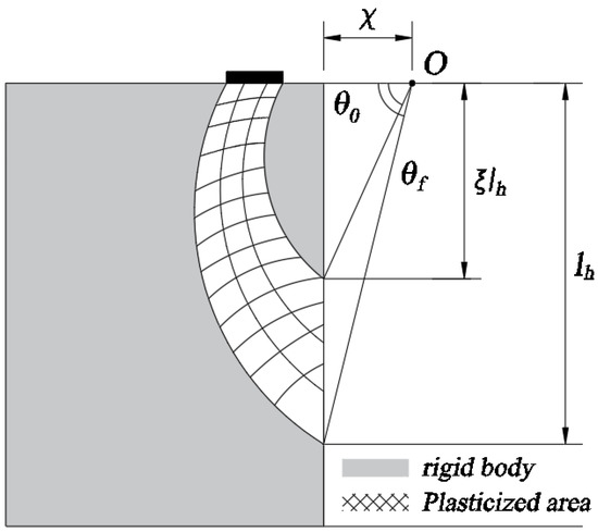 Unlike other heights, strain at the heights of 2.2 m and 3.4 m, with a 0.7 m distance from the wall, showed a large compressive strain as the load increased. This compressive strain may be owing to the plastic deformation of the soil and the resistance to the horizontal earth pressure of the rigid wall. Plumey proposed a spiral failure mechanism [31], in which the upper part of the wall is in a rigid state, and a plastic region occurs in a spiral form from the load point to the middle part of the wall, as shown in Figure 17. It was considered that compressive strain occurred in the reinforcement installed in the middle part (2.2 m, 3.4 m height) by applying force to the reinforcement while the soil moved along the plastic area. Here, the horizontal stress and displacement generated in the wall are the largest in the middle part of the wall, which is similar to the results of previous studies [8,32]. In summary, it was confirmed that when short reinforcements are used, tensile force occurs in the lower part of the wall, and a reinforcement at the 2/3 H height is governed by the compression force. This may be owing to the short reinforcement located on the inner side of the failure surface in the soil.