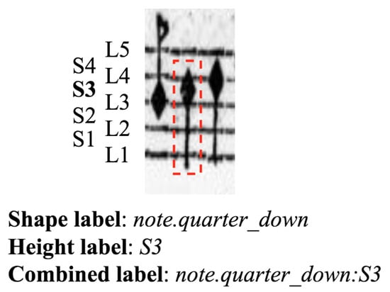 Figure 1 shows a graphical example of the commented agnostic representation for a given symbol in terms of its shape (), height (), and combined labels ().