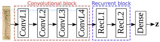 A CRNN is formed by an initial block of convolutional layers followed by another group of recurrent stages []. In such a particular configuration, the convolutional block is meant to learn adequate features for the case at issue, while the set of recurrent layers model the temporal or spatial dependencies of the elements from the initial feature-learning block.