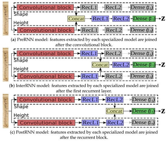 As it may be noted, all models depict three differentiated parts. Out of these three parts, two of them constitute complete CRNN models specialized on a certain type of information (either shape or height) while the third one is meant to join the previous sources of information for eventual classification. These parts are thoroughly described below:
