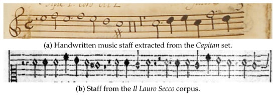 - Capitan corpus []: a manuscript of ninety-six pages dated from the 17th century of missa (sacred music). An example of a particular staff from this corpus is depicted in Figure 4a.