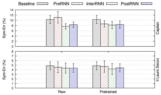 An initial remark is that, as it can be appreciated in Figure 5, all proposed architectures improve the results obtained by their respective baselines except for the case of the PreRNN architecture in the raw scenario for the Capitan corpus. By examining this graph, we may also check that the InterRNN model is the one that consistently achieves the best error rates for all scenarios considered, tied only with the PostRNN proposal for the raw case of the Il Lauro Secco set.