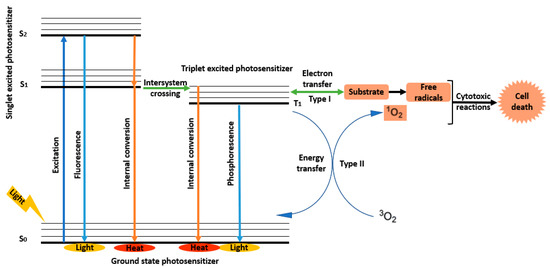 There are two main types of ROS, each corresponding to a distinctive PDT mechanism (Figure 2). By electron transfer are produced oxygen radicals (e.g., superoxide anion O2•−, hydroxyl radical HO•, hydroperoxyl radical HOO•), while by energy transfer is obtained singlet oxygen (1O2) [21]. Type I mechanism supposes the transition of PS molecules from the ground state to the singlet excited state and to the triplet excited state [8]. Then, through electron transfer, these excited PS molecules interact with the substrate to form free radicals [29,30,31]. In contrast, in the photodynamic reaction of type II, excited PS molecules transfer energy to molecular oxygen to produce highly active singlet oxygen that further interacts with lipids, proteins, and nucleic acids, causing cell death by necrosis or apoptosis [8,22,29].