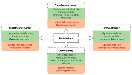 Another possibility of overcoming PDT limitations is represented by combinatorial approaches with other therapeutic modalities (Figure 5) [2]. In this way, the advantages of each treatment can be exploited, while their disadvantages can be offset. For instance, PDT might enhance antitumor immune response, and, in combination with immunotherapy, “abscopal” responses can be obtained from lesions too deep to be efficiently treated by PDT [11].