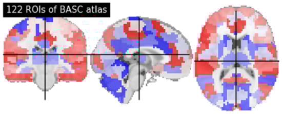 - BASC—Bootstrap Analysis of Stable ClustersThis multiscale functional brain parcellation atlas was generated from rs-fMRI images using a method called bootstrap analysis of stable clusters in []. It consists of a different number of ROIs {36, 64, 122, 197, 325, 444}. The BASC atlas with 122 ROIs was utilized in this study which is represented in Figure 3 using continuous colors.