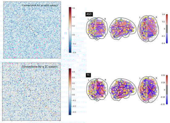 To build functional connectomes, tangent embedded parametrization of the default Ledoit-Wolf regularized covariance estimator was implemented using the Nilearn library []. Tangent space embedding uses both correlations and partial correlations to capture reproducible connectivity patterns at the group-level and models individual connectivities as deviations from the mean []. Functional connectivity matrices are represented in Figure 4 as an embedded connectome to visualize the striking differences between functional connectivity among brain regions from a random autistic and control sample.