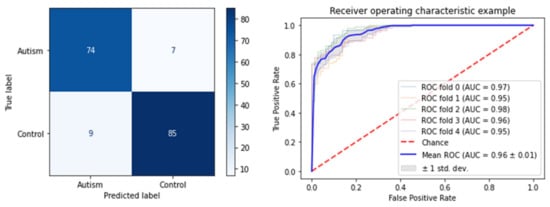 where e = Euler’s number. It exists between 0 and 1 and predicts the probability value as an output in the case of binary classification. Xavier and He weight initializers were used with sigmoid and ReLU activations, respectively. Adam, with a relatively low learning rate of 0.0001 and default parameters, was applied as the optimizer []. The binary cross-entropy loss function was used in this binary classification problem (ASD vs. control). This loss function is defined as: